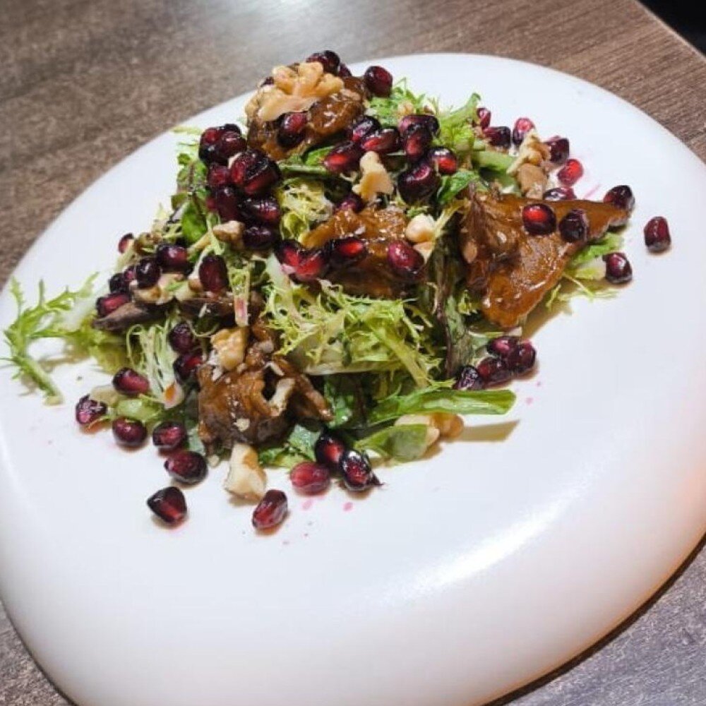 Руколо,щавель,свежий огурец,грецкий орех,граната,сыр фетакса,говяжья вырезка,азиатский соус